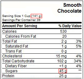 In some products the actual sugar content is disguised. The serving size may be shown in one unit of measure and the sugar content in a different unit of measure. In the label to the right, notice the serving size as 1 cup (141g) and sugars as 45g. This means that for every cup of this whey protein powder you get 1/3 cup of sugar. That’s a lot of sugar per serving.